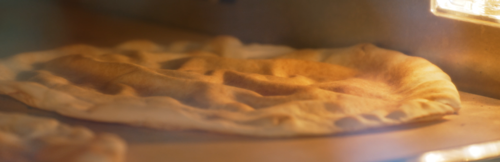 Dabei gibt es verschiedene Varianten. Bei einer flachen Option wird diese im Pizzaofen kurz aufgebacken (alternativ im vorgeheizten Ofen bei 170°C – Ober/Unterhitze).